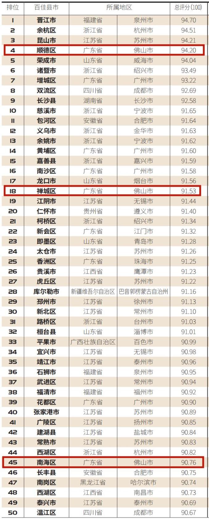 近日,由《求是》主管主办的《小康》杂志社,发布了“2020中国综合生活质量百佳县市”榜单,其中顺德区排名第4位,禅城区排名第18位,南海区排名第45位。