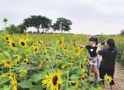 花海还吸引了不少背着专业相机捕捉美丽镜头的摄影爱好者。“无论是微距拍摄还是广角拍摄,花海的艳丽色彩,搭配着蓝天、白云、绿道、小河,就像一幅用水彩勾勒的水乡风情画。”摄影爱好者吴鸿坤穿行在花丛中,拿着相机忙个不停。