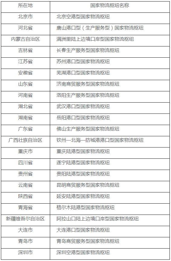 2018年12月21日,经国务院同意,国家发展和改革委、交通运输部正式颁布《国家物流枢纽布局和建设规划》(以下简称《规划》),选择127个城市布局发展国家物流枢纽。枢纽定位共6类,分别是陆港型、港口型、空港型、生产服务型、商贸服务型和陆上边境口岸型国家物流枢纽。