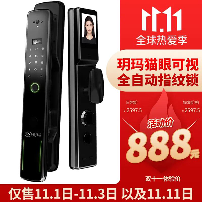 为感谢长期以来支持和信赖玥玛品牌的朋友,特在双十一购物狂欢节,京东平台价值2597.5元的上市新品——玥玛电子猫眼可视全自动智能门锁A7推出888元震撼新品体验价,限量500把。快快下单吧,愿你优先体验,好运相随。