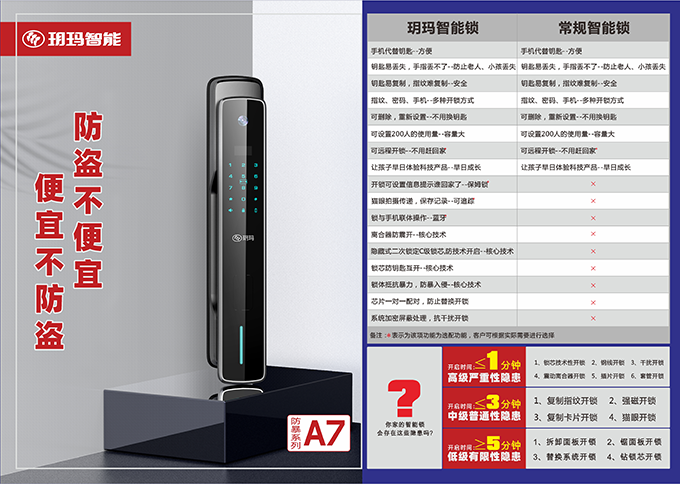 进入智能门锁时代,玥玛智能锁匠心独运,当别人都在思考如何做出高颜值、炫功能和低成本的智能门锁时,玥玛在专注智能门锁安全研究,不仅创新研发了强大的核心安全技术,如二次锁定专利技术、货真价实的真C级锁芯、防暴锁体等核心专利,同时还在硬件材质,如锁芯、锁体、手动旋钮等部件方面制定了严苛的玥玛出品标准,硬度大,强度高,坚固可靠,经久耐用,在极端高低温场景能正常使用。作为安防锁具资深企业,玥玛安防一直强调用材放松标准容易产生安全隐患,严重的还会导致重大事故。