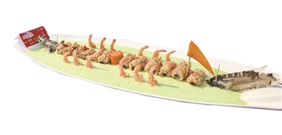 据了解,按照此次大赛要求,参赛选手需在50分钟内用高明本土食材制作一道热菜,需要用本土食材制作最地道的高明风味。而为鼓励选手们充分运用本土食材,今年百村名菜设置加分奖励,即选用荷城莲藕、杨和坚果、苗迳鹅、合水粉葛等本土食材,将可获得相应的加分。 “我是第一次参赛,做的菜叫‘龙耀沧江’。”吴英雄表示,菜品选用了鸡蛋、合水粉葛、西江明虾、西江白鳝等高明特色食材,以上翘的虾尾代桨、切片的白鳝代表龙舟、蛋液粉葛代表西江,寓意沧江上的龙舟竞渡。