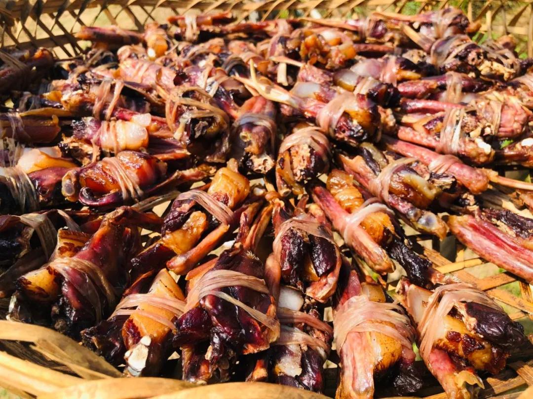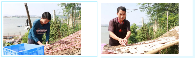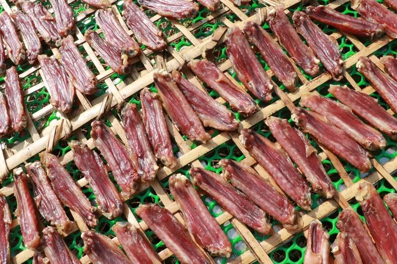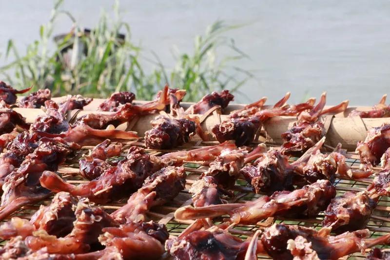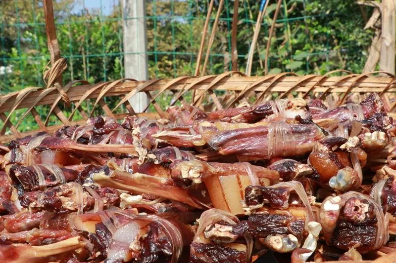 走进三水区非遗“疍家腊鸭扎制作技艺”传承人李桂英经营的富兴隆渔村的后院,我们看到一排排腊肉、一筐筐鸭下巴、鸭翅等正在阳光下晾晒,微风吹过,腊味飘香。