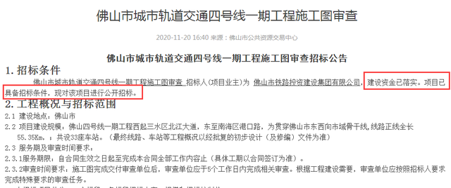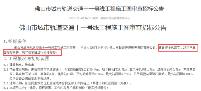 11月23日,记者从佛山市公共资源交易中心获悉,作为佛山轨道交通建设主力单位,佛山市铁路投资建设集团有限公司(下称“佛山铁投”)公布《佛山市城市轨道交通十一号线工程施工图审查招标公告》和《佛山市城市轨道交通四号线一期工程施工图审查》,两份公告均指出两个招标项目建设资金都已落实,已具备招标条件。其中佛山轨道交通线四号线(下称“地铁4号线”)一期工程共约33个站点,而佛山轨道交通线十一号线(下称“地铁11号线”)则有换乘站11座。
