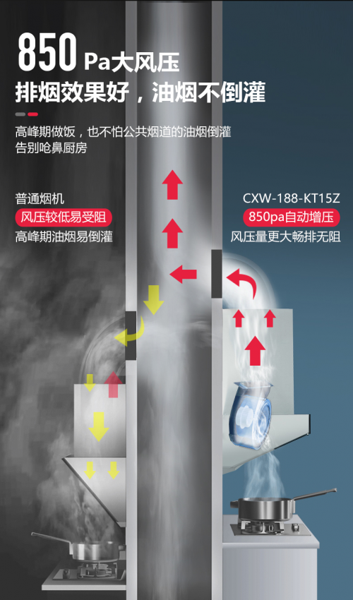 850帕大风压,排烟效果更好:现在小区里面绝大部分家庭厨房排烟使用的都是公共烟道,当同一时间小区很多住户都在做饭使用油烟机时,由于公共烟道在同一时间的排烟能力有限,如果用户厨房使用的油烟机风压较小、排风能力弱的话,这些用户家里就会出现厨房油烟排不出去或公共烟道里面的油烟出现倒灌进厨房的现象。厨房油烟机的排烟效果好不好主要靠的是油烟机风压是否足够大,通常风压越大的烟机代表排烟效果就越好。目前市面上一般普通的烟机风压只有400帕左右,而家丽雅KT15Z大风压油烟机的风压最大能达到850帕,是普通烟机排烟能力的2倍以上,彻底解决了厨房油烟排不出、油烟倒灌等问题。