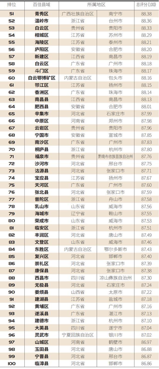 百强榜中,省会及地区级城市所辖区49个、县级市34个、县级单位17个,省会城市占据了半壁江山,地区级城市和县级市占据另一半江山,与中国县域综合实力在各级县域的产能权重相契合。