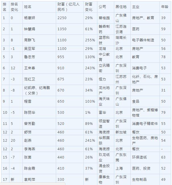 榜单前十名女企业家平均财富1019亿元,平均涨幅为91%,比去年的56%有明显上涨,且远高于前十名男企业家69%的平均涨幅。前十名门槛比去年上升66%,达到530亿元。杨惠妍财富增长500亿元,以2250亿元位居榜首。早在2007年,26岁的杨惠妍就曾以1200亿元身家首次问鼎胡润中国女企业家榜。截至2020年,杨惠妍已有八年在该榜上“夺魁”,从2017年起连续四年位居第一名。