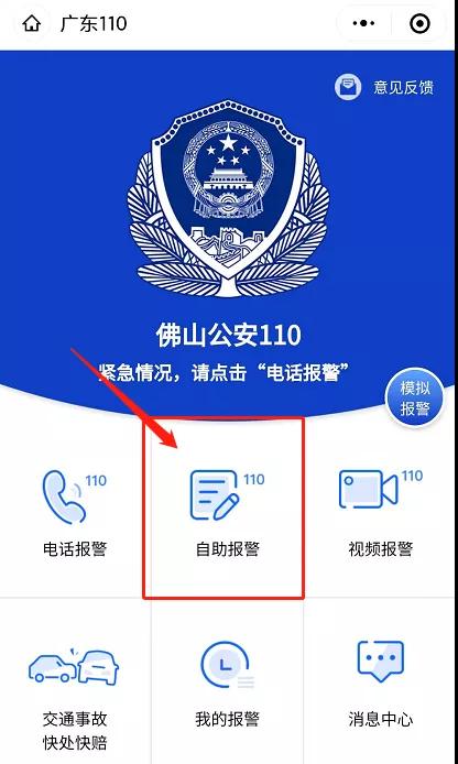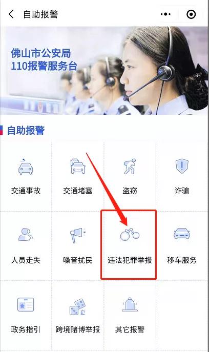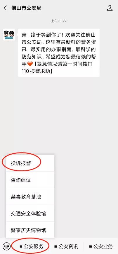 关注“佛山市公安局”官方微信公众号,点击菜单栏“公安服务”>“投诉报警”;