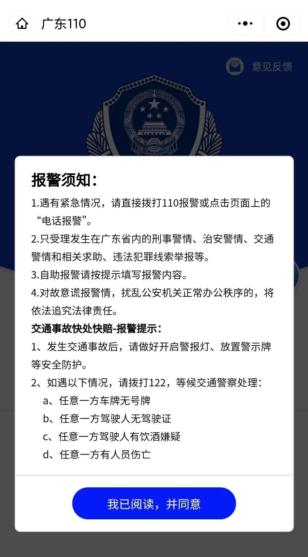 仔细阅读“报警须知”并点击“我已阅读,并同意”;