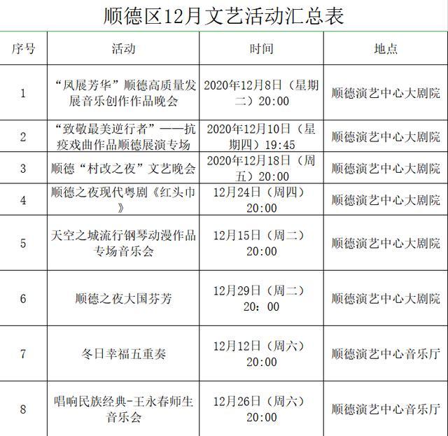 记者了解到,“凤展芳华”顺德高质量发展音乐原创作品晚会将于12月8日举行;“致敬最美逆行者”——抗疫戏曲作品顺德展演专场将于12月10日举行;顺德“村改之夜”文艺晚会将于12月18日举行。