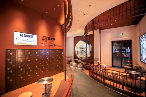 据了解,作为深圳百店的“赭”主题店,是喜茶以中国传统颜色为灵感来源创作的中国风主题门店,是喜茶追求设计感、传承中国文化的最新探索和成果。此外,该门店融入了中国古典园林“庭深几许”的概念,从苏式园林建筑体系中提炼出廊桥、窗花等元素,运用赭石色和牙色作为主色调,在空间内移步换景,带来古色古香的沉浸式体验。