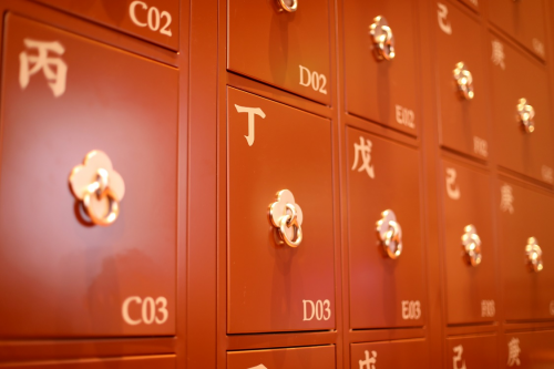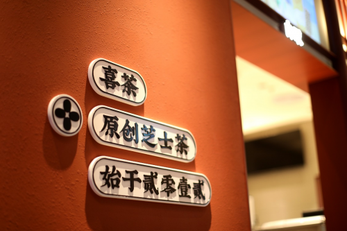 取茶柜也同步变身为赭石色柜体,锁头成为了拉手,用天干地支代替数字编号,让原本智能化的设计增添了古典的反差感。菜单牌摒弃电子屏幕,改为瓷砖印字竖体展示喜茶经典的产品种类,上下藏光、在细节上极其用心。店内取消了英文的“Inspiration of tea”,换成了古风汉字。部分供休息的桌椅也使用了石凳样式,围桌而坐、饮茶品茗,感受惬意时光。