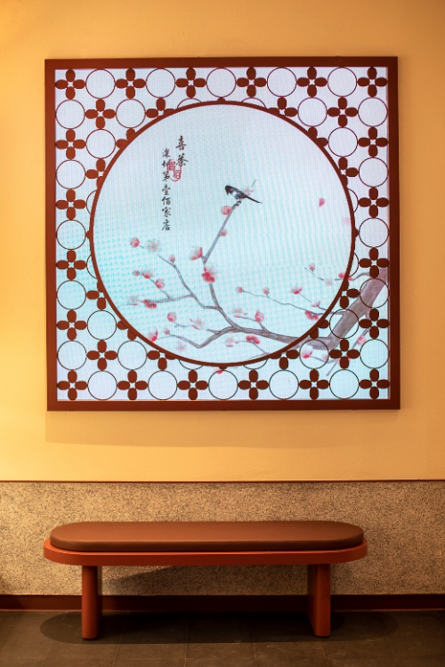走进店内,移步异景。中式园林中常见的廊桥、美人靠等元素融合在店内,廊桥贯穿整个空间,借景与隔景交织出现,使得空间曲折多变、小中见大、虚实相间,令人感到妙趣横生。