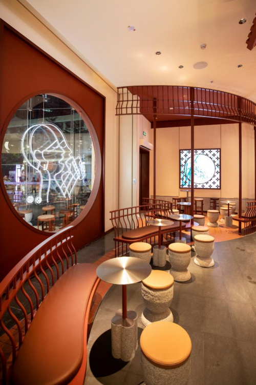 喜茶“赭”主题店位于深圳国际时尚精品购物中心KKMall,运用独特的赭石色,根据中式园林“院落三进”的布局,这家店的外摆区、用餐区、水吧区被巧妙地设计出了层次感,让顾客可以在古朴而优雅的环境中静心享用饮品。
