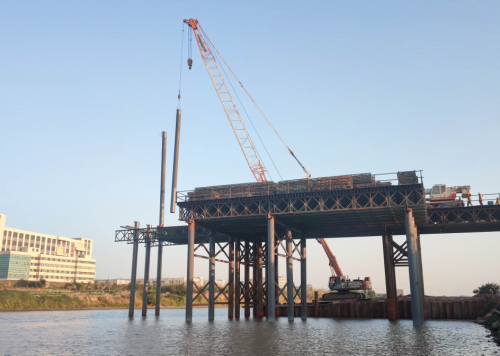 自2020年8月10日项目施工启动以来,项目经理部积极推进各项施工工作,征地、驻地建设、测量规划、地质勘察等各项工序繁忙有序。记者在现场看到,除了工作人员的驻地外,现场还建设好了1号混凝土拌合站以及其他建设材料生产加工区,大量石柱、钢板等建设材料已被生产出来堆放在工地,同步钢栈桥搭建、便道施工等也紧张地进行中。