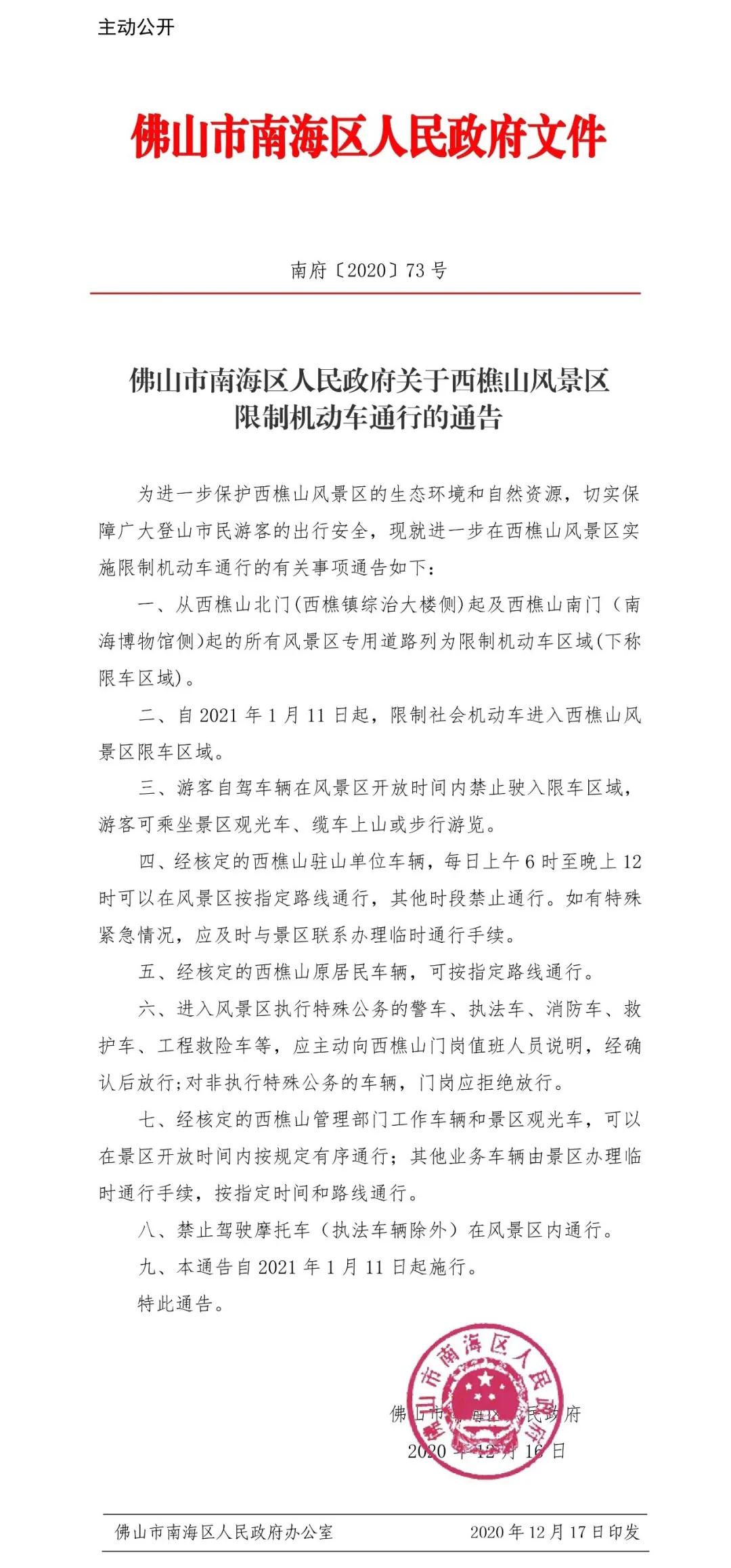 根据《佛山市南海区人民政府关于西樵山风景区限制机动车通行的通告》,自2021年1月11日起,西樵山风景名胜区内实行限制机动车通行管理。