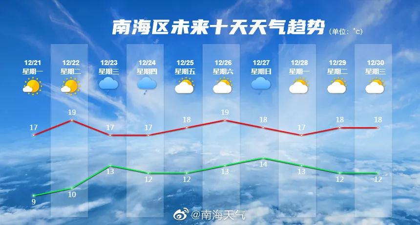 冷空气正“排队发货”,冬至后陆续到达。南海区气象局预计,未来数天,南海本地天气将会出现小雨,21-22日以多云到晴天气为主,日间气温回升;23-24日受南风和冷空气影响,转阴雨天气,日温差减小。