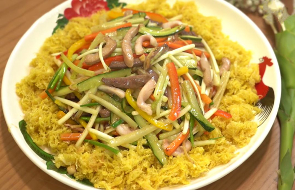 把鸡蛋去壳搅透,将鸡肉丝拌上鸡蛋液,再拌上湿生粉。用中火烧镬下油,将蛋液徐徐倒入镬中,边用勺子搅动以免聚拢成片,炸成细丝后捞起。将鸡丝拉油后捞起,下姜米爆香,接着先下熟笋丝炒片刻,随即加入卤猪舌丝、卤猪肚丝、青红椒丝、韭黄段、湿冬菇丝、葱榄等同炒,注入少许上汤,溅入绍酒调味,加入麻油,撒上胡椒粉,用湿生粉勾芡,加包尾油炒匀上碟,将炸好的蛋丝分伴四边。此菜制作的关键是先行将鸡蛋打透,落镬炸时就易于炸成蛋丝;若鸡蛋打不透,油炸时会成片。