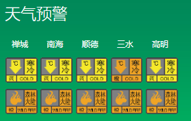 禅城、南海、顺德、高明寒冷黄色预警已生效,三水寒冷橙色预警已生效。
