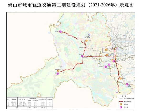 佛山市城市轨道交通2号线二期、4号线一期和11号线,规划期为2021-2026年,总里程115.8公里,其中佛山段总里程约110.8公里,广州段总里程约5公里,总投资772.13亿元,其中佛山段总投资736.18亿元,广州段总投资35.95亿元。