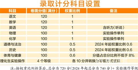 根据《实施意见》,自2023年起,中考物理、化学、生物实验操作考试成绩与录取挂钩,报考提前批学校必须达到3个C级或以上。从2024年起英语科听力部分改为单设听说考试,道德与法治、历史科各按卷面分值60%的比例计入总分,中考总分增加到740分。