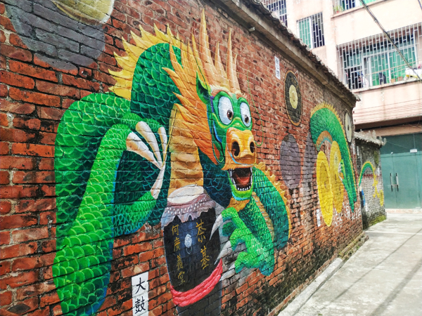 寓意深远的茶基十番、奋力向前的扒龙舟、憨态可掬的醒狮……一个个富有南海民俗元素的形象就被“搬”上了茶基村的墙上。行至一处,或许便可以偶遇这红砖白墙上活灵活现的民俗风采。传统文化习俗在这一面面墙上展现得淋漓尽致,趣味十足。