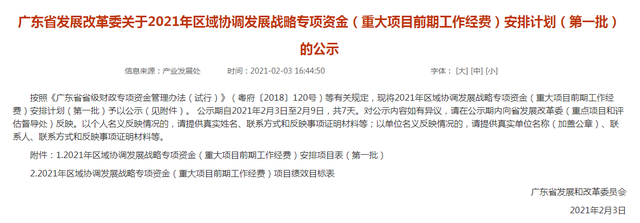 2月3日,乐居从广东省发展和改革委员会处获悉,广东省发展改革委关于2021年区域协调发展战略专项资金(重大项目前期工作经费)安排计划(第一批)公示,合计94项重大项目。