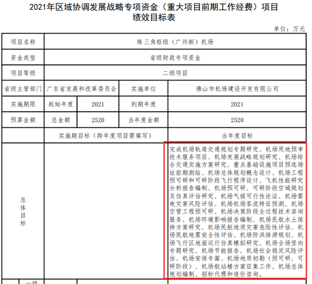 另据同步公示的项目绩效考核表显示,珠三角枢纽(广州新)机场前期工作经费预算2520万元,项目预计总投资517.85亿元,2021年度计划目标为机场轨道交通规划专题研究、机场用地预审技术服务项目等一系列报告、规划编制研究。