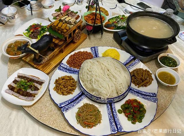 三是高明濑粉,夹半碗手工制作的濑粉,盛一勺熬好的猪骨高汤,加上姜、葱、蒜、花生、菜丝、鸡蛋丝、肉丝等配料,一碗浓香的濑粉就制作成了。