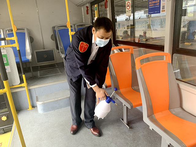 覃重章在车厢中消毒。/李智辉摄