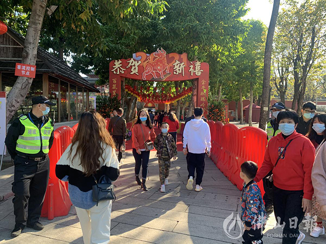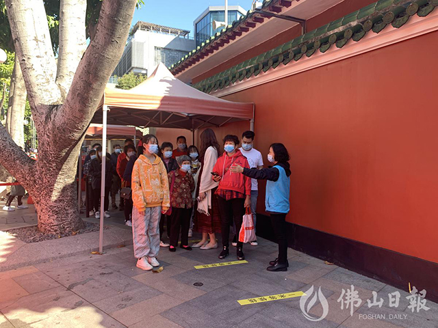 根据上级部门疫情防控工作部署,佛山市祖庙博物馆在春节期间采取限流措施,每日接待游客量不超核定最大承载量的50%。预约人次为25000人/天,开馆至13:30预约名额12500人,13:30至闭馆预约名额12500人。12日是佛山市祖庙博物馆春节期间采取限流措施的第二天,仅上午时段就有12400多人预约进馆。虽然排队入园的人数较多,但是大家都按照现场工作人员指引,自觉佩戴口罩,有序验码入馆。