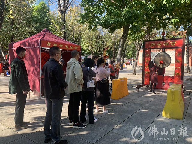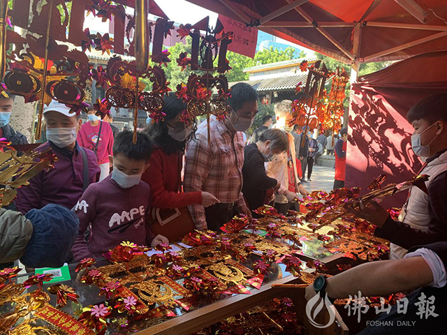 “万福台前买风车,将福气带回家。”祖庙行运大风车摊位吸引了不少市民游客驻足选购。市民洪女士说,每年正月初一起床吃过早餐后,全家人穿上新衣,高高兴兴来到祖庙祈福,今年也不例外,“祈求一年风调雨顺,蕴含着对美好生活的期许。” 为了切实做好春节期间疫情防控工作,祖庙博物馆不仅实行“先约后游”的预约参观机制,还暂停了黄飞鸿武术醒狮表演、万福台粤剧表演以及人工讲解服务,馆内所有区域禁止燃香。尽管少了往日喧闹的锣鼓声,市民都表示理解。“灵应池前掷币许愿,敲响金锣祈福,还有许多方式寄托美好的祝愿。”市民麦小姐说,往年她也喜欢在大年初一到祖庙看醒狮表演,希望新年里“生生猛猛”,而今年她就选择敲金锣的方式祈愿牛年“有声有色”。