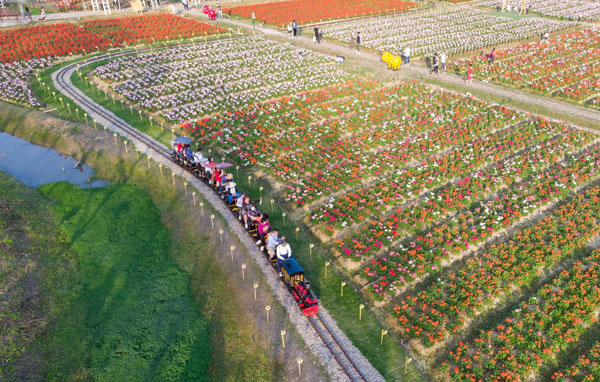 游客乘坐小火车徜徉在高明盈香生态园花海之中。佛山日报记者洪海摄