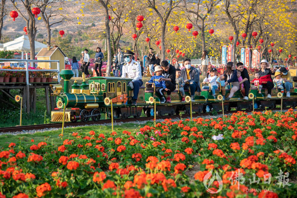 游客乘坐小火车在花海中穿越。佛山日报记者洪海摄