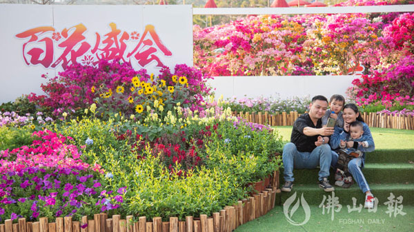 游客与园区内的百花盛会合影留念。佛山日报记者洪海摄