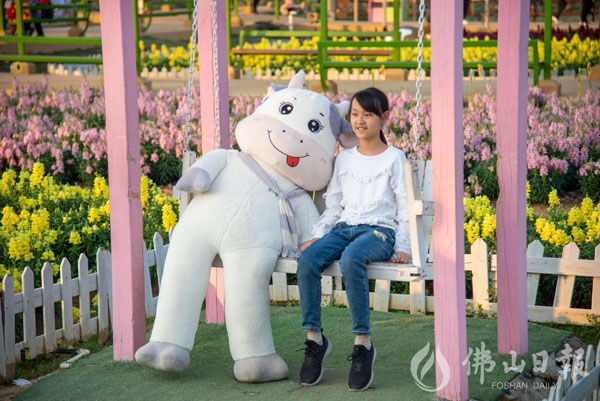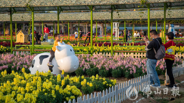举办花海游艺会的盈香生态园受到游客的热捧,景区内遍布牛型雕塑。景区多个打卡点还设置了红桥、花山、蔗墙等景观,营造出红红火火的喜庆氛围。游客中不乏留在佛山过年的市民,优美的景区景色,极大程度地丰富了留在佛山过年的年味。