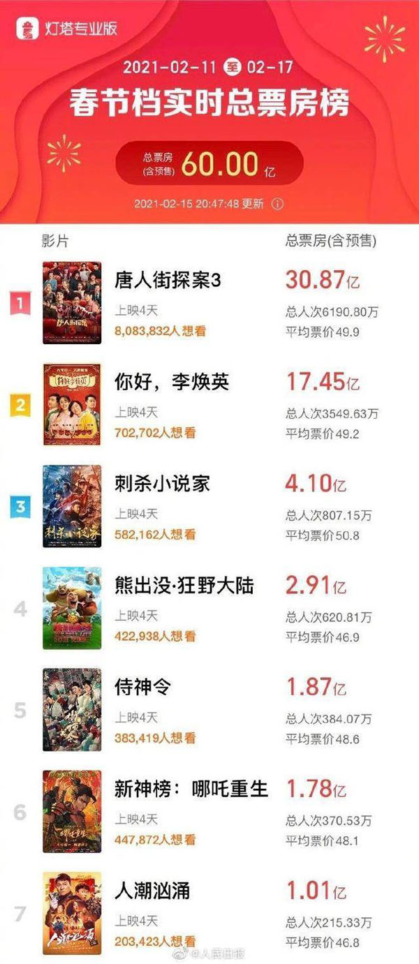 2021年春节档电影票房破60亿元