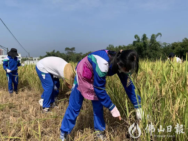 华附南海高中学子正在农田里收割稻谷。