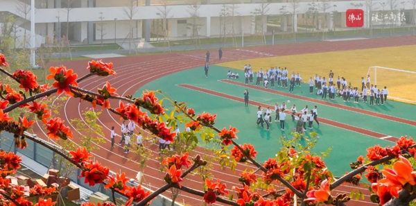 在朝阳照耀下,顺德区第一中学(南校区)师生精神抖擞,在崭新的校园操场活动。