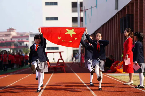 迎着晨光,南海区桂城街道灯湖第六小学的同学们举办升旗仪式。佛山新闻网记者裴鑫 摄