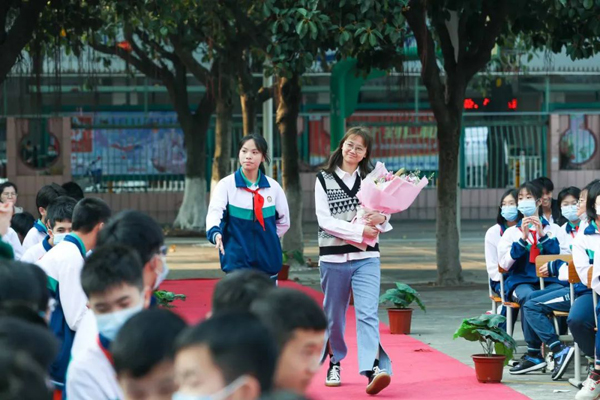 在鲜花和掌声的包围下,佛山市第三中学初中部校内多位优秀教师走上红毯,前往颁奖台接受表彰。佛山日报记者符诗贺 摄