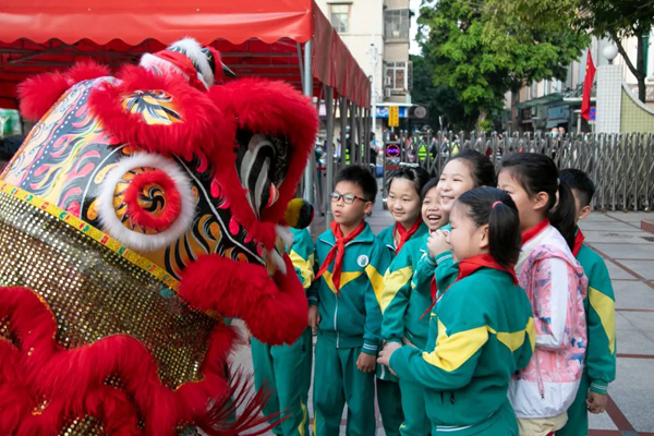 佛山市同济小学门口,有醒狮队伍迎接学子,让同学们十分开心。佛山新闻网记者邓锦壕 摄