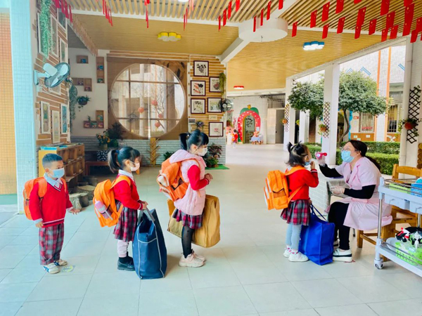 返园后,顺德区伦教街道三洲幼儿园的小朋友们在排队晨检。