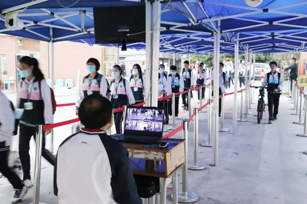顺德区乐从镇沙滘初级中学学生佩戴口罩,有序测温进校。佛山新闻网记者周淑敏 摄