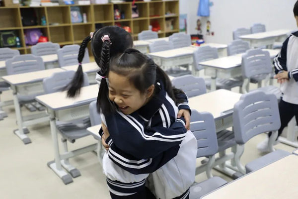 顺德区北滘镇群力学校的同学回到教室,兴高采烈地和伙伴们拥抱起来,还有同学迫不及待地分享假期的欢乐。