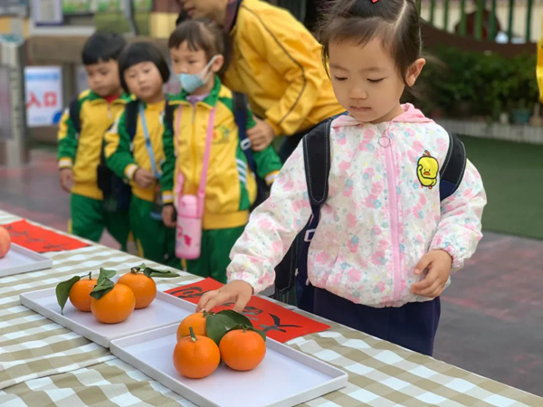 南海区桂城天佑幼儿园的小朋友入园摸了摸葱、苹果、桔子,寓意聪明伶俐、平平安安、大吉大利。