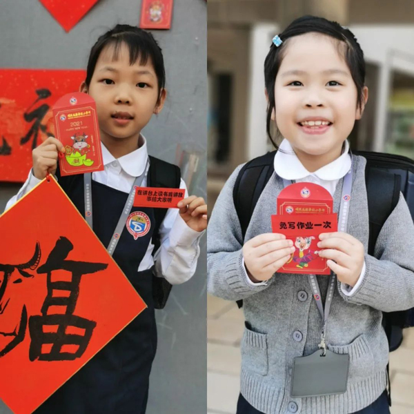 广东顺德德胜学校小学部同学抽取“免写作业一次”等特别的新年红包。