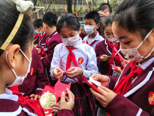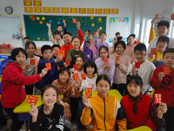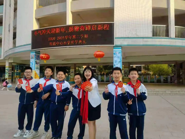 禅城区玫瑰小学的孩子们举着老师送的祝福红包,开心地一起合影。