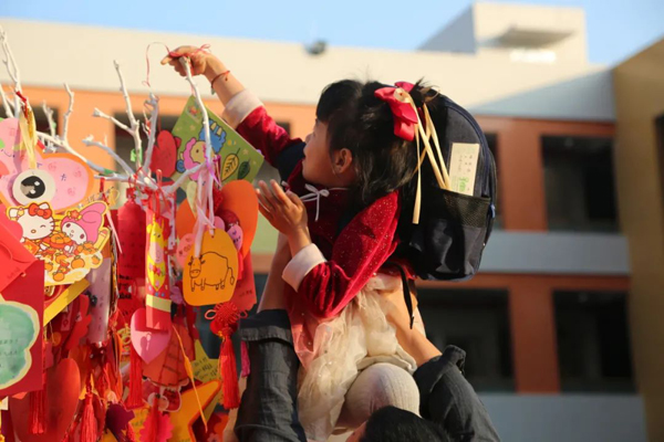 开学首日,高明区蓓蕾幼儿园的小朋友往树上挂上新学期“心愿牌”。佛山新闻网记者王满昌 摄