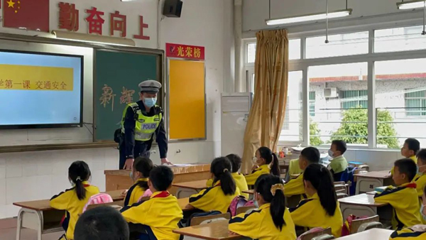 交警叔叔给南海区桂城街道东翔学校学生带来开学第一课,普及摩电交通安全知识。佛山日报记者王旖荻 摄